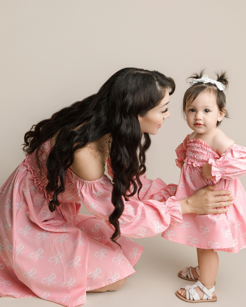 Calliope Puff Sleeve Off Shoulder Dress - Pink Bows
